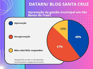 Segundo pesquisa do Instituto DATARN, encomendada pelo Blog Santa Cruz e realizada nos dias 4 e 5 de dezembro, a gestão municipal do prefeito José Aracleide de Araújo (Kêka), enfrenta uma divisão opinativa. Com uma margem de erro de 2%, 47% dos entrevistados expressaram desaprovação, enquanto 40% manifestaram aprovação.